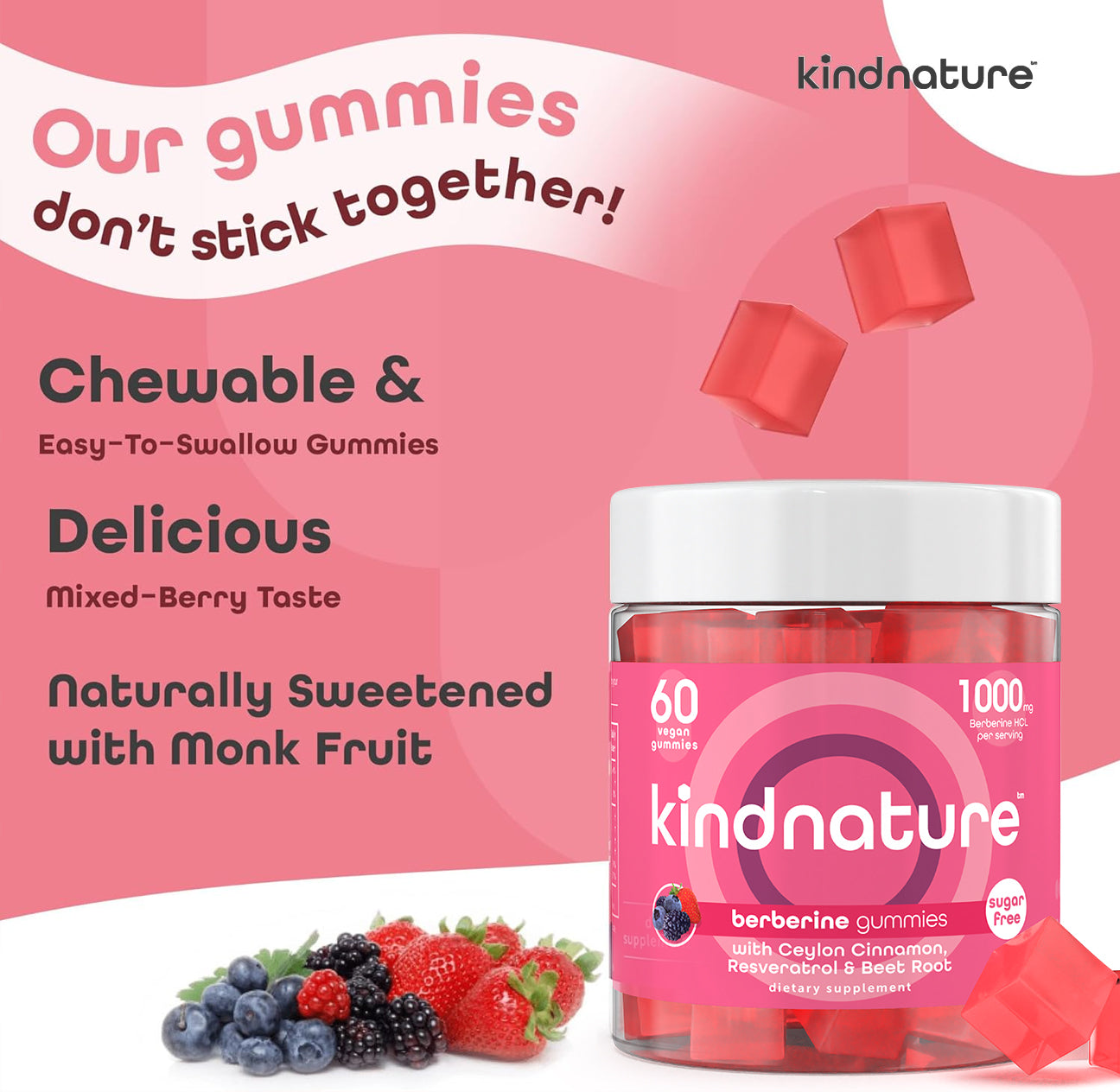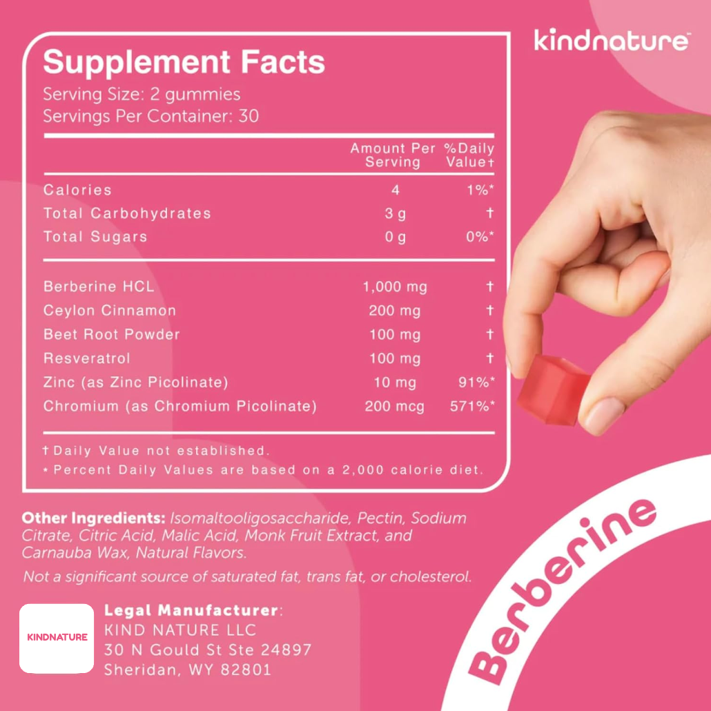 KINDNATURE's formula goes further. We enhance Berberine with Ceylon Cinnamon for insulin sensitivity, Chromium for glucose metabolism, Zinc, Resveratrol, and Beet Root — six ingredients working in synergy. And because a blood sugar supplement with added sugar would defeat the purpose, ours is sweetened with monk fruit. Zero sugar. Zero glycemic impact.