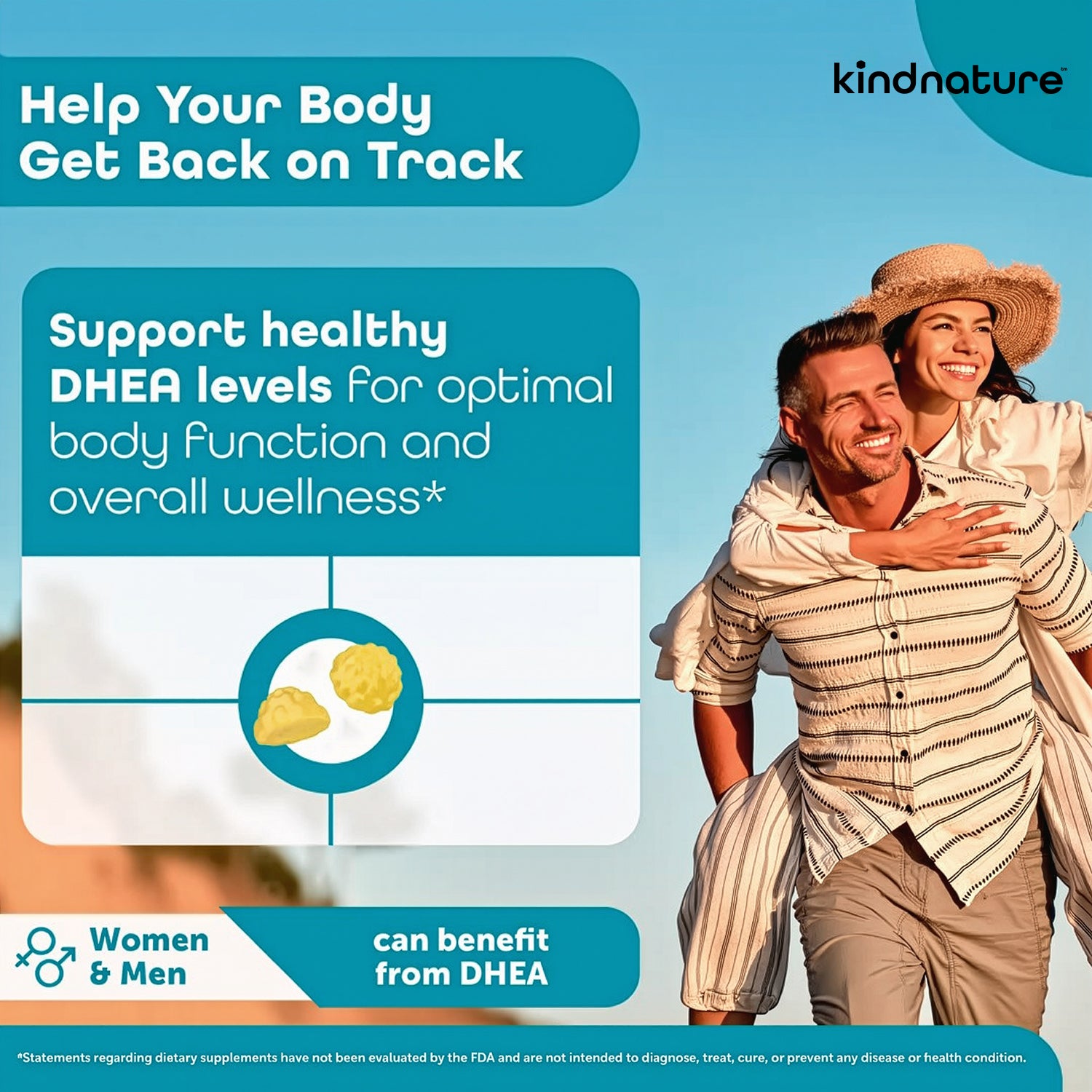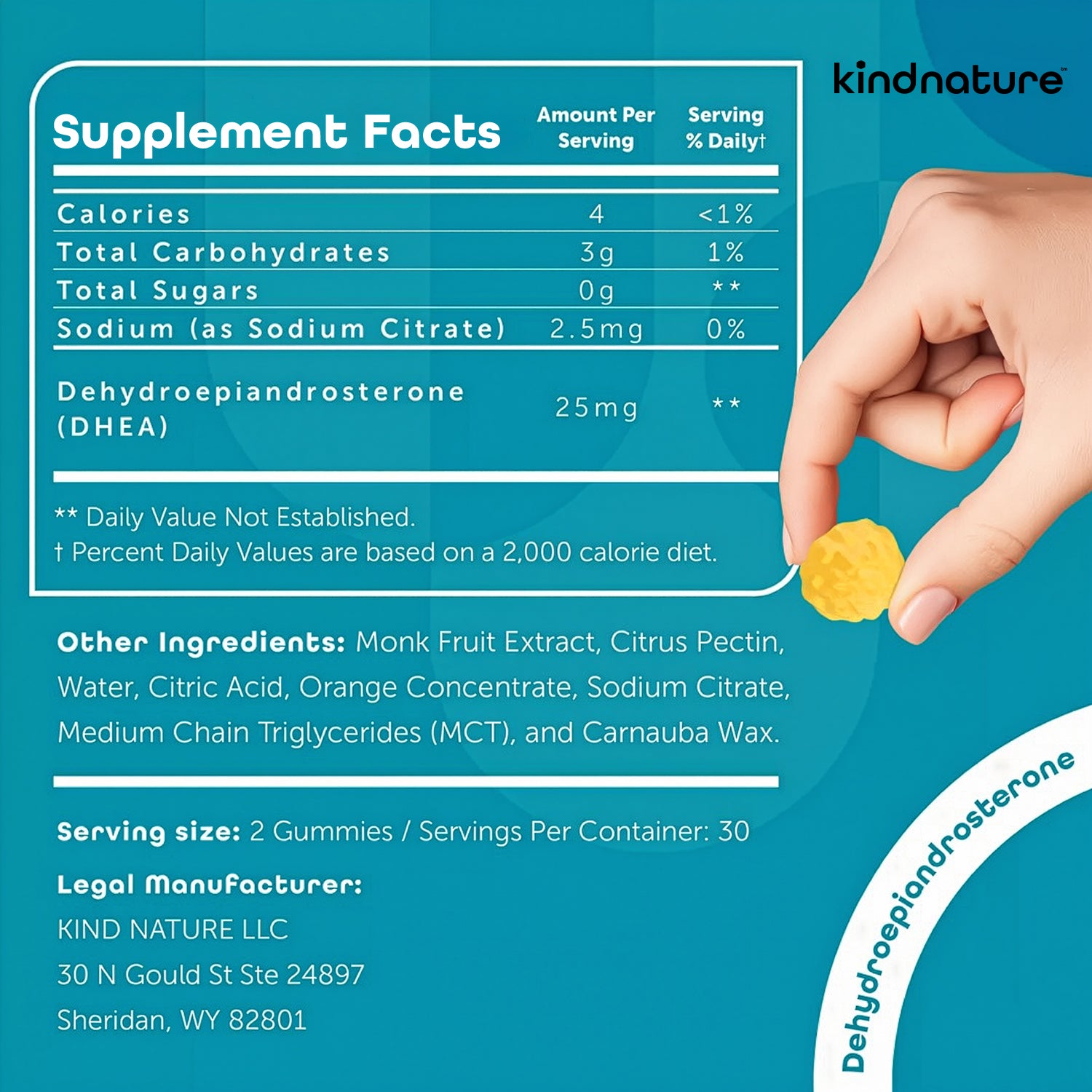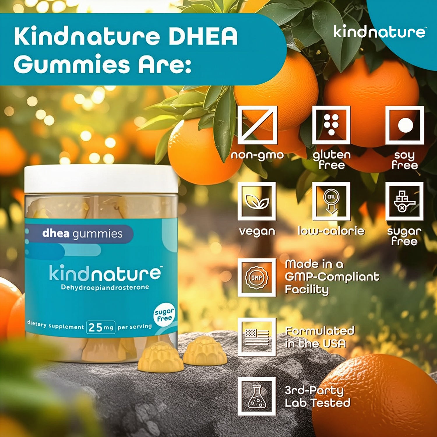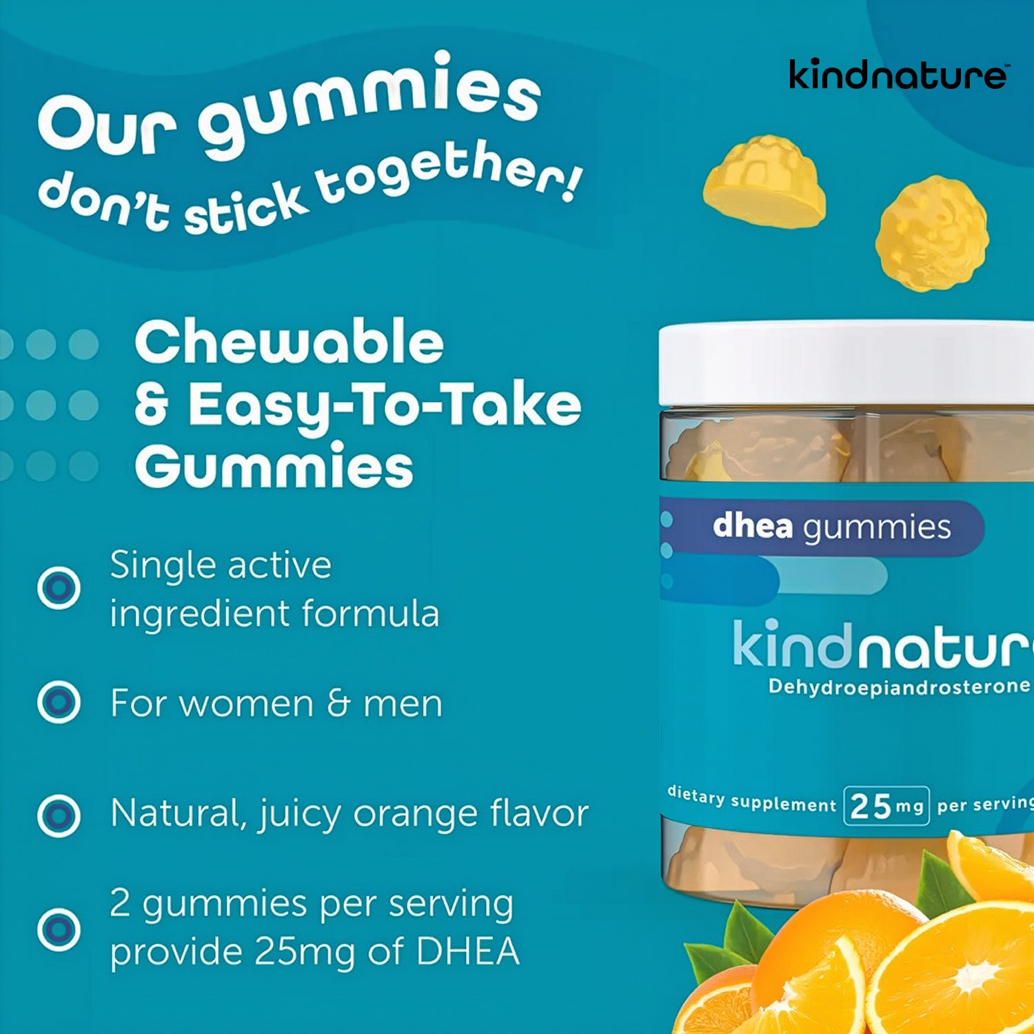 KINDNATURE delivers 25mg of pure DHEA per gummy — the clinically researched dose recommended by healthcare providers. No overdosing. No underdosing. Just one gummy a day in a sugar-free orange formula designed for both men and women.